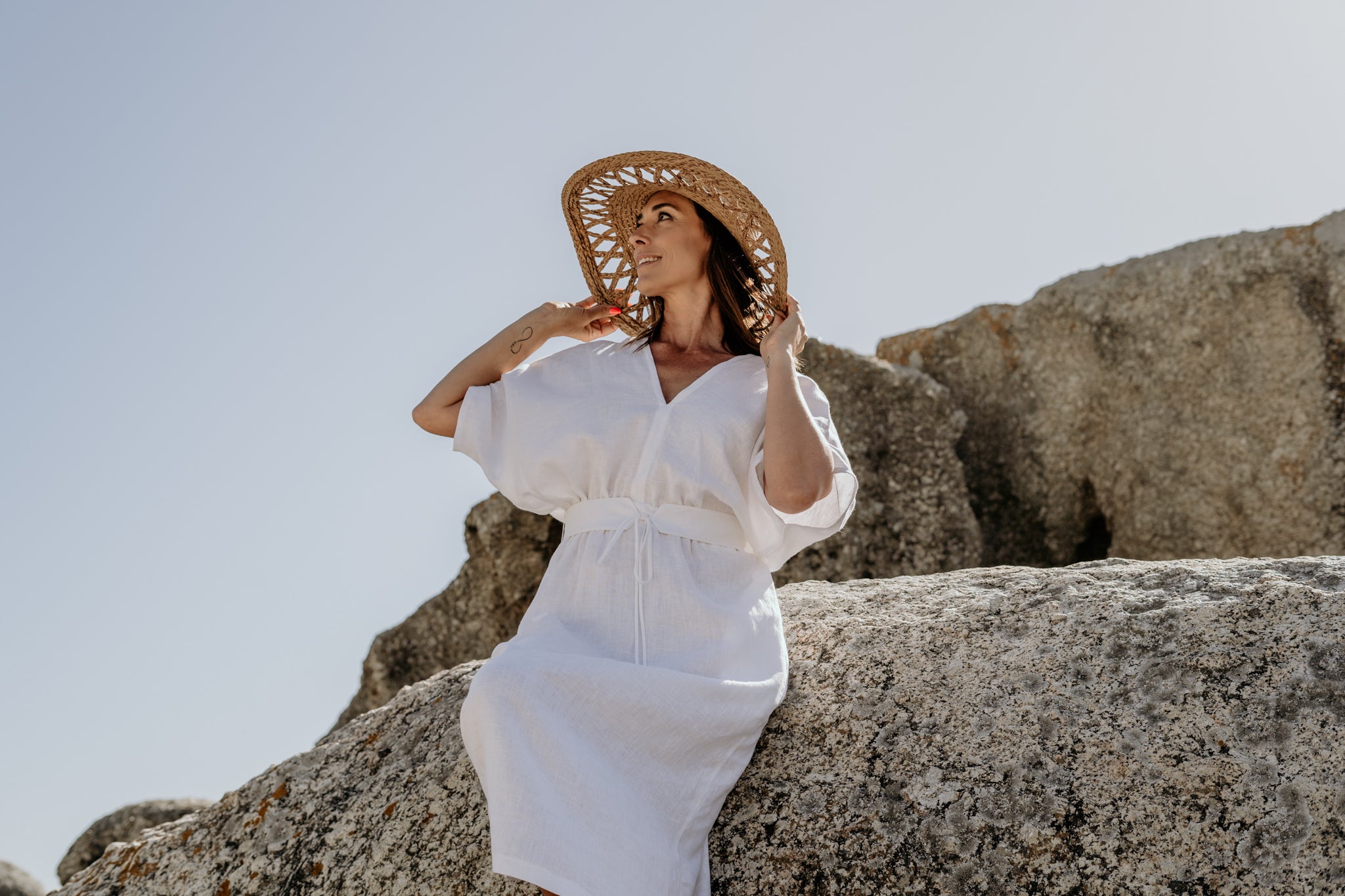 An effortlessly sophisticated kimono with simple lines. Meira is crafted from 100% pure linen. Featuring an elegant V-neck, an elasticated waist and a self-tie belt to add shape. This stylish dress also has side pockets for extra comfort.